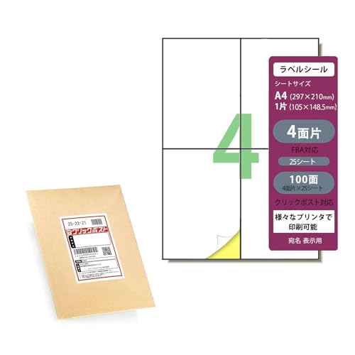 クリックポスト対応の強粘着ラベルシール。A4サイズ、4面シール用紙で、インクジェット・レーザープリンタ対応。25シートで計100面。宛名表示に最適です。