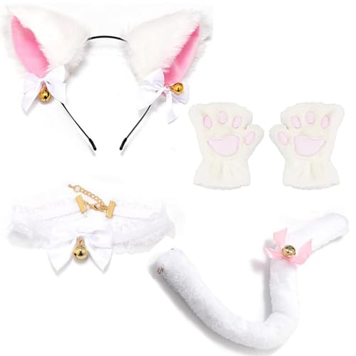 GOODCHIの猫耳カチューシャ、首輪、肉球手袋、しっぽの4点セット。ハロウィンやコスプレに最適で、可愛いデザインのホワイト。鈴付きで蝶結びのトリミングが特徴。