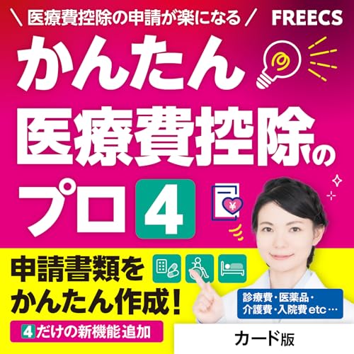 FREECS|かんたん医療費控除のプロ4は、医療費控除の計算と確定申告を簡単にサポートするソフトです。ユーザーフレンドリーなインターフェースで、必要な情報を入力するだけで簡単に申告書を作成できます。