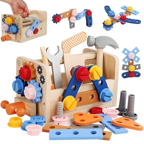 TYORORO 大工おもちゃは、組み立てタイプの木製ツールボックスで、ねじやハンマー、ドライバーが付いています。子どものDIYごっこ遊びに最適なモンテッソーリ知育玩具です。男の子・女の子向けの新年・誕生日・クリスマスプレゼントにもおすすめ。