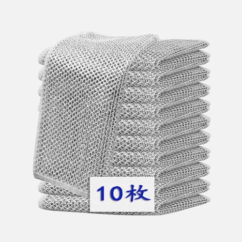 Ouliyooの金属ワイヤーふきんは、メッシュタイプのキッチンタオルで10枚入り。抗菌加工、速乾性に優れ、油汚れや泡立てにも最適。台所や浴槽洗いに多機能に使用可能で、サイズは20×20センチメートル。