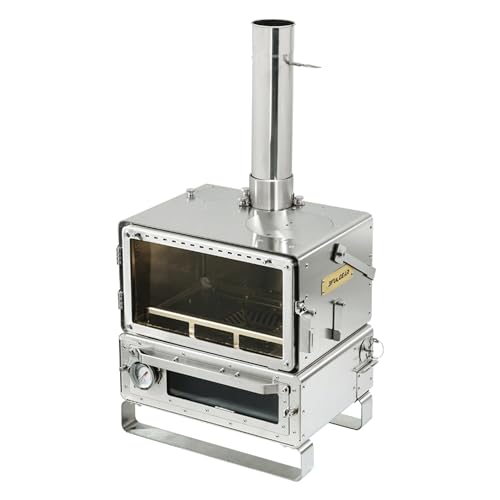 3F UL GEARの薪ストーブは、二次燃焼システムと温度計を搭載。ダブル煙突口と耐熱ガラスで、調理も可能。軽量でキャンプに最適、収納袋や手袋も付属しています。