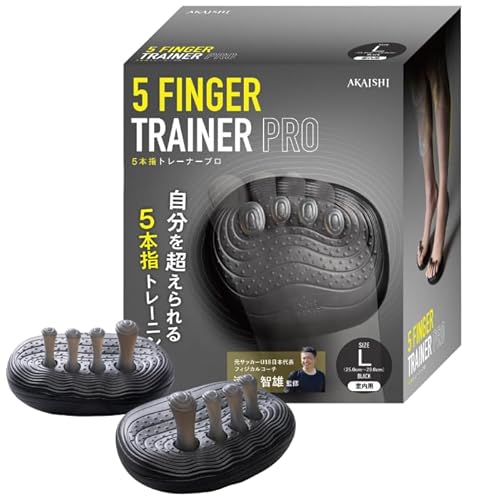 アカイシ 5本指トレーナーPROは、足指を鍛えるためのスポーツトレーニンググッズです。津越智雄監修のもと、Lサイズ(25cm-29cm)のブラックカラーが特徴。購入特典として井村屋のえいようかん1本付き♪