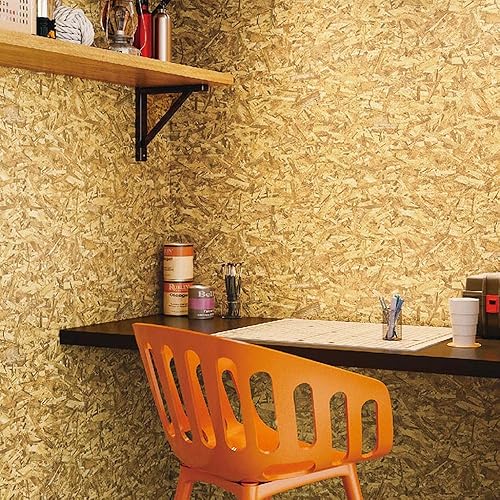 壁紙屋本舗の生のり付きクロス、木目柄のブラウン色。OSB合板風で幅93cm、長さ10m。替刃付きで、受注生産品のためキャンセル不可。
