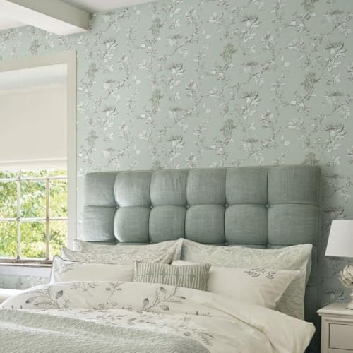 壁紙屋本舗の生のり付き花柄壁紙、ローラアシュレイデザイン。ボタニカルスタイルで緑色を基調としたシンコール製品。幅92.5cmで切り売り、受注生産品のためキャンセル不可です。
