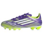 アディダスのジュニアサッカースパイクF50 LEAGUE HG/AG。サイズ17~24.5cm、ユニセックスで男の子・女の子兼用。カラーはパープルラッシュ/フットウェアホワイト/ルシッドレモン、品番JH7752。