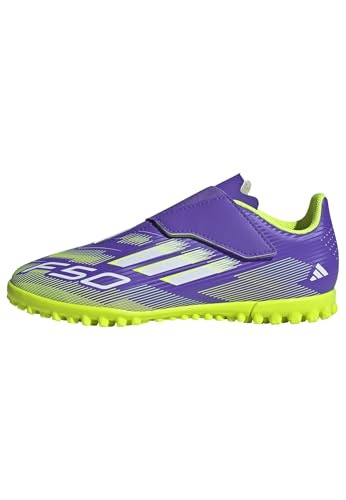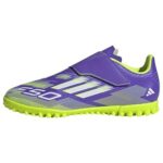 [アディダス] フットサルシューズ ジュニア F50 クラブ VEL TF。17~24.5cmのユニセックスモデル。カラーはパープルラッシュ/フットウェアホワイト/ルシッドレモン (JI0034)。サイズ20.5cm。