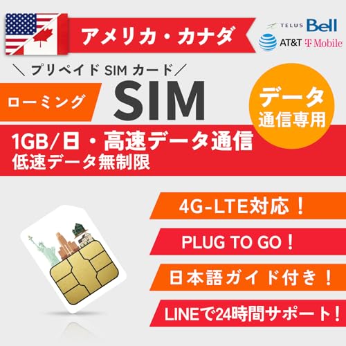 アメリカ・カナダ向けのプリペイドSIMカード。7日間有効で1日1GBの高速データ通信が可能。T-mobile、AT&T、TELUS、BELL対応。年中無休・24時間サポートあり。