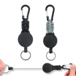 DMEEKの2個セットリールキーホルダーは、カラビナ付きで伸縮性があり、最長60cmの金属ワイヤーを使用。紛失防止に最適で、キャンプやハイキング、釣りに便利な反射材付きのブラックとグレー。