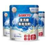 SAMKYOの食洗機用洗剤タブレットは、60個入りが3袋で合計180回分。強力な洗浄力と手軽な使用感が特徴。忙しい家庭の食器洗いをスムーズにします。