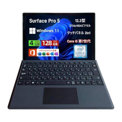 整備済み品のMicrosoft Surface Pro5は、Core i5-7300U、12.3インチディスプレイ、メモリ4GB、SSD 128GBを搭載。Windows 11とOffice 2019がインストールされており、日本語キーボード付きの2in1タブレットです。