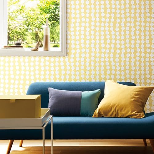 壁紙屋本舗の生のり付きクロス、フィンレイソンのPAMPULAです。黄色の幾何学柄が特徴で、サイズは幅92.5cm×10mです。サンゲツ RE55787、替刃付きで、北欧デザインのお部屋に最適です。