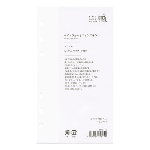 竹尾のシステム手帳リフィル、ケイトジョーオニオンスキンホワイトは、50枚のリーフレットとリフター2枚が付属。バイブルサイズで、軽やかな手触りと高い書きやすさが特徴。オフィスや日常使いに最適です。