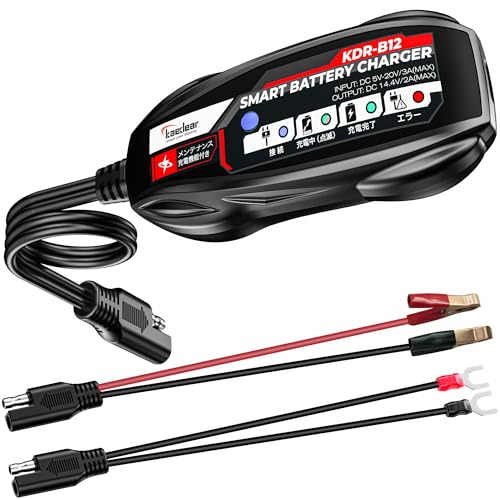 Kaedear バイクバッテリー充電器 2Aは、コンパクトで持ち運びに便利な充電器です。過充電防止機能付きで、安全にバッテリーを充電できます。12Vバッテリー対応で、バイクのメンテナンスに最適です。