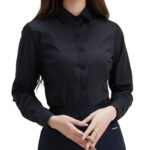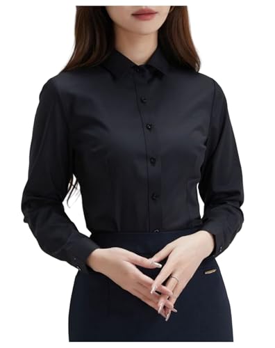 シャツ ブラウス レディース 長袖 竹繊維使用で形態安定。ノーアイロン仕様でオフィスやカジュアルに最適。高通気性で春秋の通勤や日常に便利。サイズS、ブラックカラー。