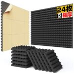 吸音材24枚セット。接着剤付きで簡単貼付。高密度ウレタンフォーム製、サイズ30x30x5CM、35kg/㎥。防音室や室内装飾に最適なブラックの吸音パネル。難燃性で騒音対策に効果的。