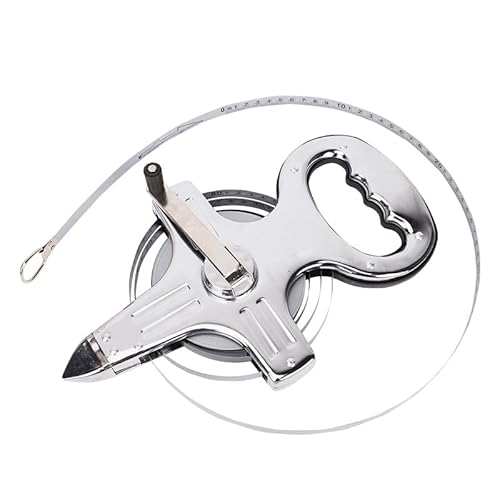 LIVIAのステンレス製メタルハンドル付き巻尺は、工事用の手巻きメジャーで、頑丈な大スチールフレームを採用しています。測定長は50mで、耐久性と使いやすさが特徴です。