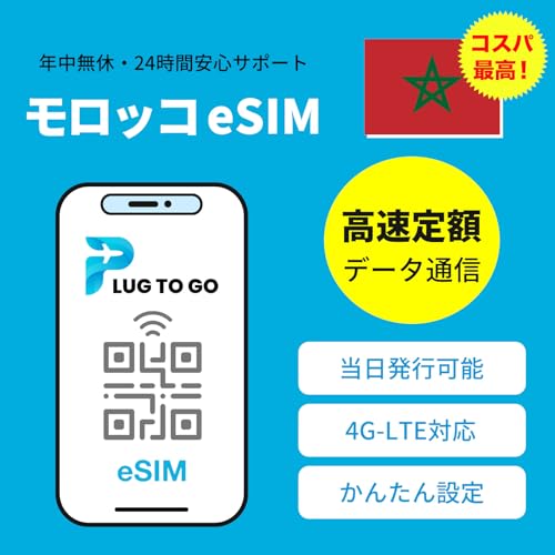 モロッコの30日間5GB高速データ通信のeSIM。4G-LTE対応で、当日発行可能。データ通信専用、LINEで24時間サポートあり。