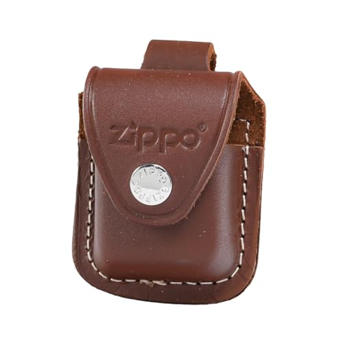 ZIPPOの専用革ポーチケース、ブラウン色のボタン留めタイプ。軽量でコンパクトなデザインが特徴で、ジッポーライターをしっかり保護します。並行輸入品。