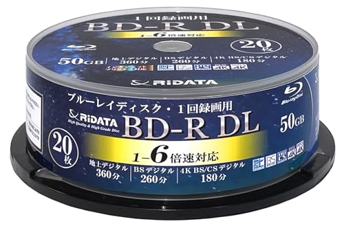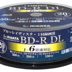 RIDATAの1回録画用ブルーレイディスクは、片面2層のBD-R DLで容量は50GB、1-6倍速対応。ホワイトプリンタブル仕様で20枚入り、スピンドルケースに入っています。