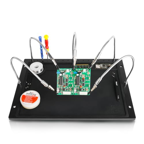 Kaisiのハンダゴテ台は、5本のクリップ付きフレキシブルアームと耐熱シリコン製はんだマットを備えた補助具です。組み立て、修理、モデリング、手工芸やジュエリー制作に最適。