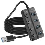 USBハブ 4in1 USB3.0は、120CMケーブル、5Gbps高速転送、軽量・コンパクト設計。USBポート独立ON/OFFスイッチとLED表示灯付き。PC、HDD、SSD、PS4/PS5対応。テレワークやリモート勤務に最適。