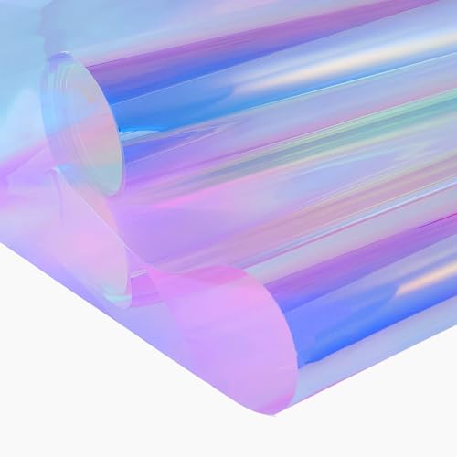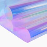 窓カメレオンフィルムはUVカット機能付きのガラスフィルムで、ガラスの飛散防止効果があります。手作り素材としてDIYやショーウインドウ装飾に最適。サイズは44.5cmx200cm、カラフルな青虹色デザインが魅力です。