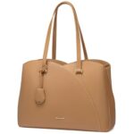 LOVEVOOK女性用ワークラップトップトートバッグはベージュのレザー製で、15.6インチノートパソコンに対応。教師やプロフェッショナルに最適な大容量トートバッグです。