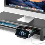 EAYHMモニター台は、USB2.0/3.0データ転送とTYPE-C充電機能付き。引き出しとスマホホルダーを備え、耐荷重25kgでパソコンやプリンター、タブレットに最適です。
