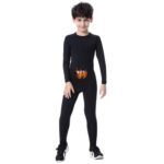 Muxuryeeのキッズスポーツインナー上下セットは、裏起毛デザインで防寒性に優れ、サッカーや野球に最適。長袖インナーシャツとスポーツタイツのコンプレッションウェア。サイズ140、色はBK/BK。