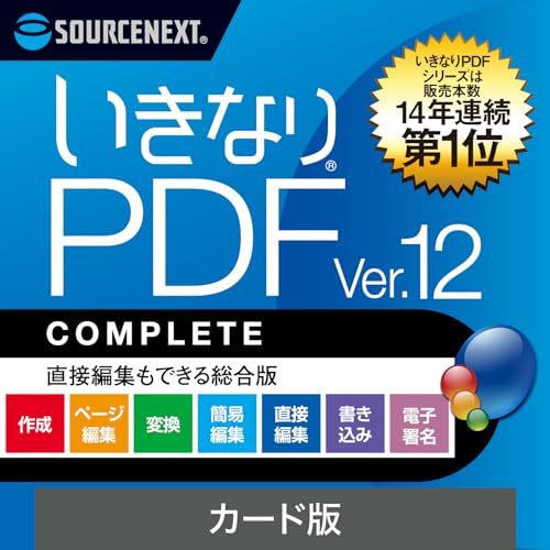 ソースネクストの「いきなりPDF Ver.12 COMPLETE」は、PDFの作成、編集、変換が可能なソフトです。Windowsに対応しており、直感的な操作で使いやすさを重視した設計です。
