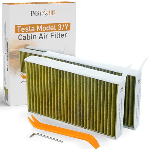 Teslaモデル3/Y用のキャビンエアフィルターセット。OEM交換品で、全モデル年式に対応。必要なツールと説明書付き。活性炭使用で空気清浄効果あり。