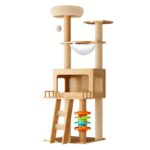 Elegaifのキャットタワーは、147cmの木製スリムデザインで、省スペース型。透明ボウルと宇宙船付きで、多頭飼いやシニア猫、短足猫、子猫にも対応。頑丈で安定感があり、腕の筋力も鍛えられる天然麻紐の爪とぎ付き。階段や多ステップで運動不足解消に最適です。