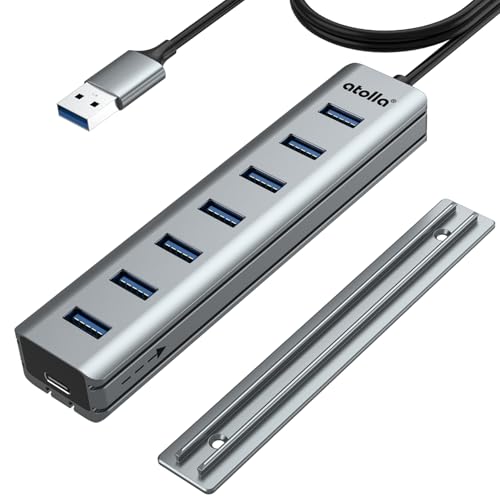 atolla USB3.0ハブは7ポートで、スライドレール固定式。100cmケーブル、5Gbps超高速転送、追加5V/3A電力供給ポートあり。幅広いOS対応で在宅勤務に最適。