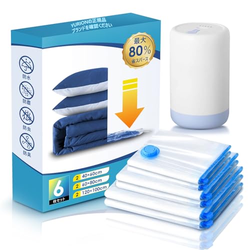 YURIONの布団圧縮袋6枚セットは、衣類や布団の収納に最適なアイテムです。手動・電動ポンプで簡単に圧縮でき、空気をしっかり遮断して湿気や虫を防ぎます。整理整頓に役立つ便利なサイズです。