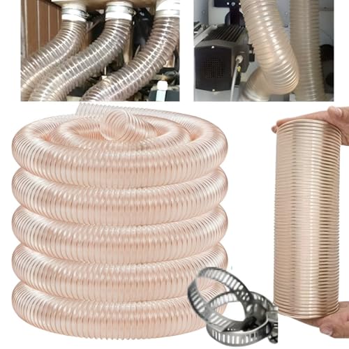 集じん機用のフレキシブルホース(内径40mm、長さ1m)。銅メッキ鋼線製ホースバンドセット付き。耐摩耗性、排気ホースとして静電気帯電防止効果あり。温度範囲-40~120℃、四季を通じて使用可。