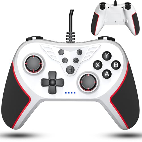 Elnicec Switch コントローラーは有線接続で、背面ボタン、マクロ機能、Turbo機能を搭載。4階段HD振動、人間工学設計、2.2Mケーブル、対応機種はSwitch/Switch有機EL/PC/Android。日本語取扱説明書付き。