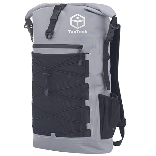 TaoTechの防水バッグは、リュックタイプのドライバッグで、ターポリン素材を使用。背面クッション付きで快適な使い心地。30Lの大容量で、アウトドアやスポーツに最適な男女兼用のグレー色です。