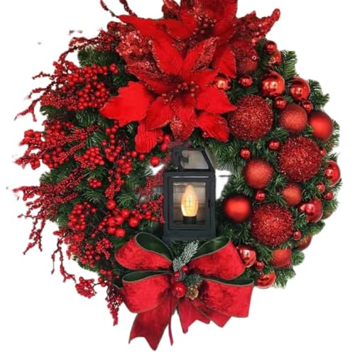 Ameckeクリスマス飾り、赤い花やオイルランプを使用した豪華な40cmのクリスマスベリーのリース。玄関やドア用に最適な贈り物です。