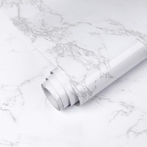 Cosnight 壁紙シールは、大理石調のデザインで60cmx5mのサイズ。厚手で防水・防油、耐熱性があり、光沢のある仕上がり。貼って剥がせるので、浴室やキッチン、トイレ、テーブル、家具のリフォームに最適(白・グレー)。