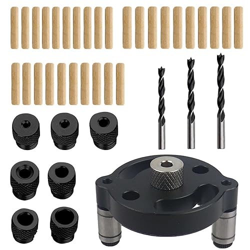 ドリルガイドは木工用の垂直穴あけツールで、ポケットホールジグやダボ穴治具として使用します。穴あけ精度を高め、直径6/8/10mmに対応したブラックのガイドキットです。