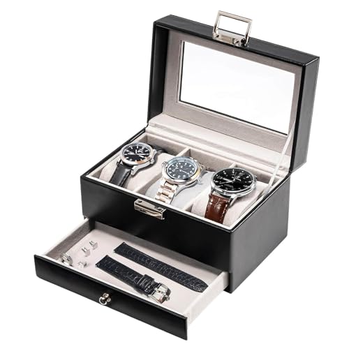 Mocamoro 腕時計ケースは、3本収納可能な2段式デザインです。高品質な素材で作られ、時計をしっかり保護。スタイリッシュな外観で、旅行や収納に最適です。