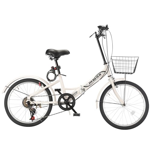 JIEBEIERの折り畳み自転車は、20インチの高炭素鋼フレームで軽量。7段変速、カゴ、ワイヤー錠、ライト、防滑タイヤが搭載されており、通勤・通学に最適です(カラー:ホワイト)。