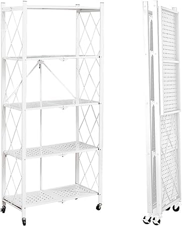 KRTDの折りたたみラックは、幅70cmでキャスター付き、移動も簡単。5段式で大容量、メタルスチール製のオープンシェルフ。食器や調味料の収納に最適、電子レンジも置けます。防サビ加工で耐久性も抜群。