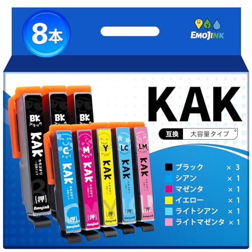 Emojink KAK-6CLはEPSONのEP-717A、EP-817Aに対応した互換インクです。6色のカラーインクに加え、黒インクが2本含まれ、合計8本のカートリッジです。残量検知機能にも対応しています。