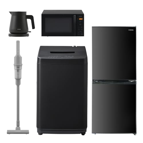 アイリスオーヤマの新生活セットには、4.5kgの洗濯機、142Lの冷蔵庫、17Lのレンジ、黒のケトル、コードレス掃除機が含まれています。これで新生活を快適にスタート!