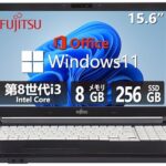 整備済みのFMVシリーズノートパソコン。第8世代Core i3、15.6型画面、8GB RAM、256GB SSD、Windows 11、Office 2019搭載。無線Wi-Fi、USB 3.0、DVDドライブ、テンキー付き。白・黒選択可能。