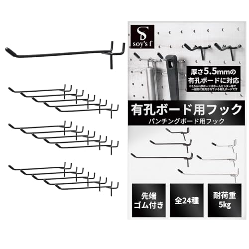 SOY’S Fの有孔ボードは、穴ピッチ25mm、穴径5mmの設計で、ボード厚は5.5mmです。15cmサイズの黒色フックが15個セットになっており、固定金具やゴム付きで便利です。