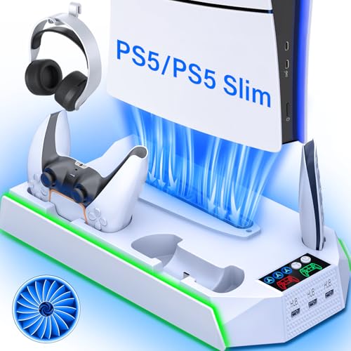 PS5スリム冷却ステーションは、RGBライト、クーラーファン、3つのUSBハブ、ヘッドセットホルダー付き。コントローラー充電も可能。