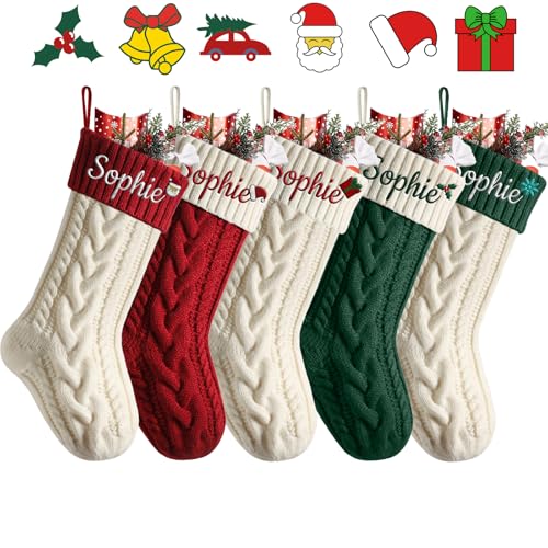 5個のパーソナライズされたクリスマスストッキング。アイコン付きでカスタムネーム可能。Lサイズ(18インチ)、ニット素材。暖炉に吊るして、ホリデーファミリーパーティーを彩ります。